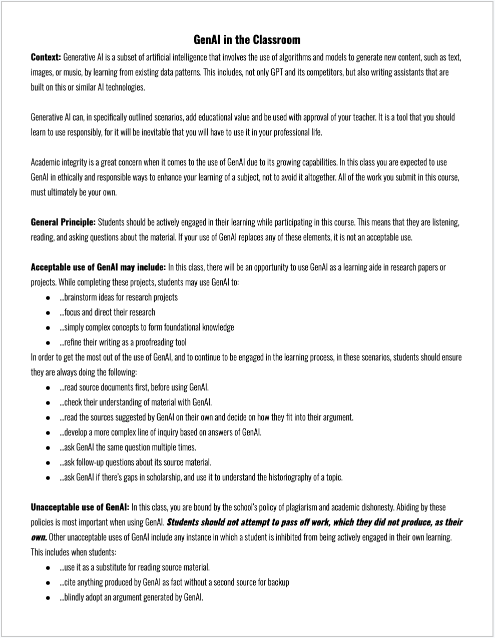 This document is guided by the principle that students should be actively engaged in their learning while participating in this course. This means that they are listening, reading, and asking questions about the material. If they are using GenAI to replace any of these elements, it is not an acceptable use in my class.